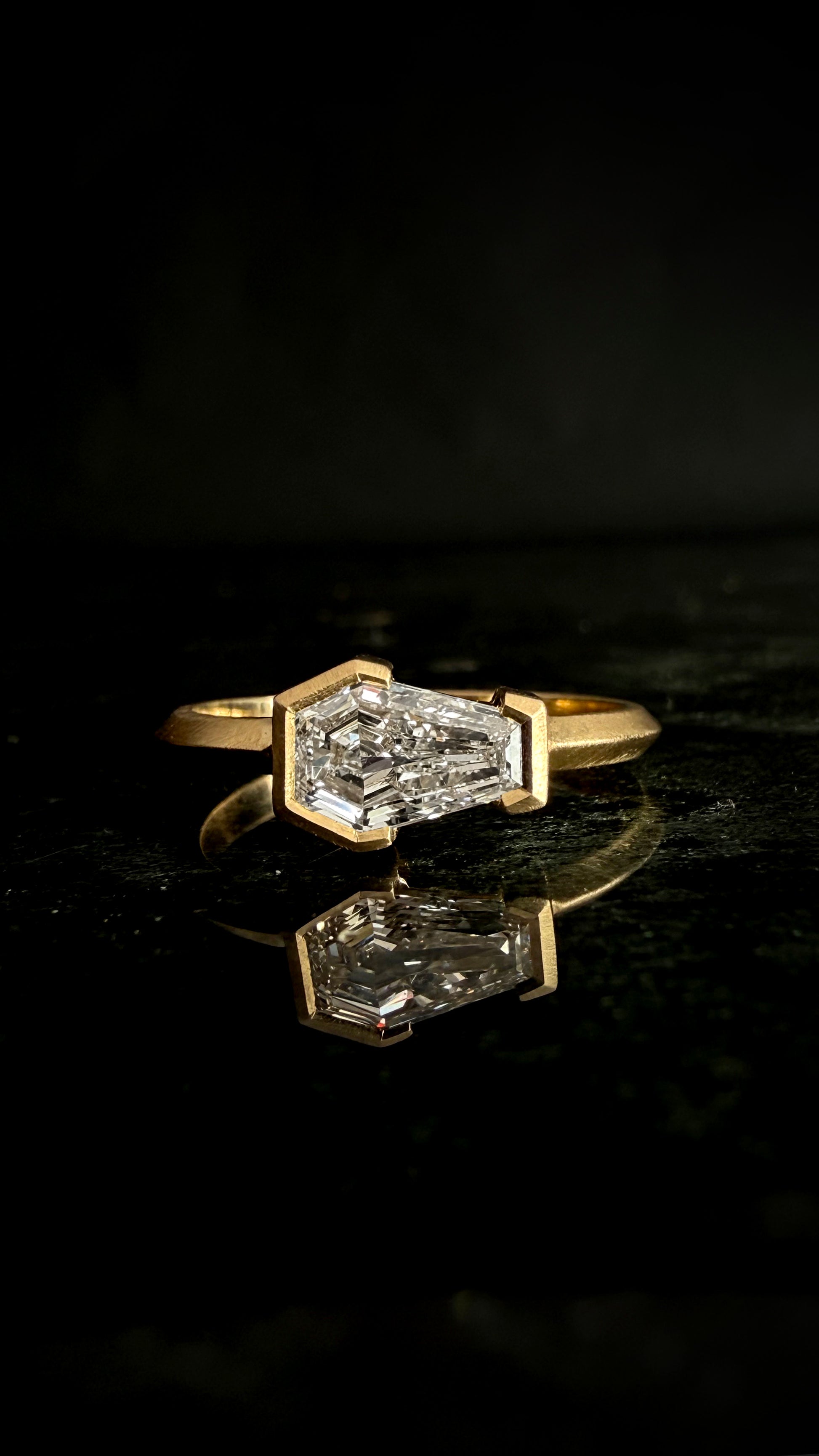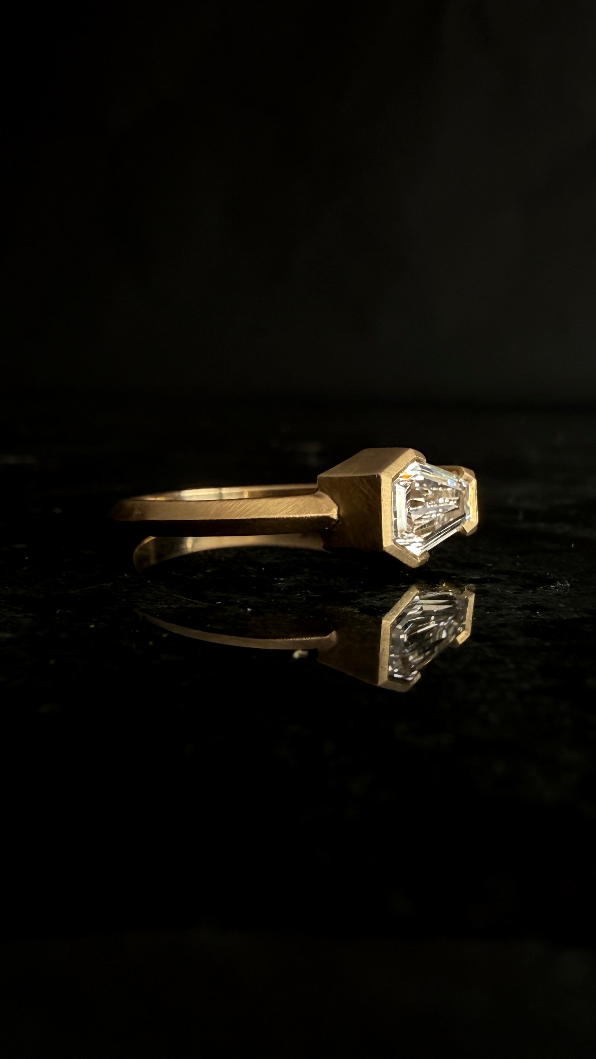 Lilith is your twitchy witchy girl. Sparkly as the deepest part of the Andromeda galaxy and unapologetically powerful, the Lilith Ring features a coffin-shaped lab grown colorless diamond set in a partial bezel. The satin-finish yellow gold contributes to a perfect balance between luxury and subtlety. A tribute to the goddess of myth and shadow—protector of strong women and untamed spirits—Lilith is for those who embrace their magic without fear.